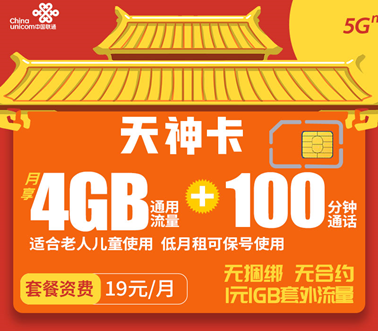 资费:月租19元=4G国内流量+1元/1G/天+100分钟免费通话+5个联通亲情号(含首年每月1G优惠)