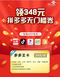 l 资费:月租29元=2G通用流量+20G定向流量+100分钟国内语音+每月20元拼多多无门槛券+拼多多省钱月卡权益