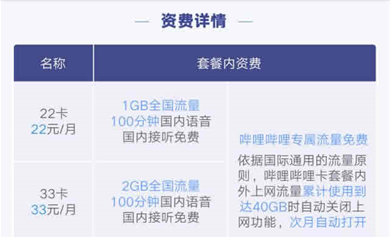 l 资费:月租22元=2G国内通用流量+B站系应用免流(30G)+100分钟语音通话+全国联通基友号+5元/GB/月+福利社&直播礼包
