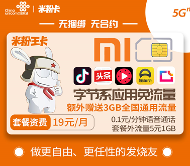 l 资费:月租19元=3GB全国通用流量+字节系应用免流+5元/GB/月+来电显示+小米手机专属福利+5个亲情号